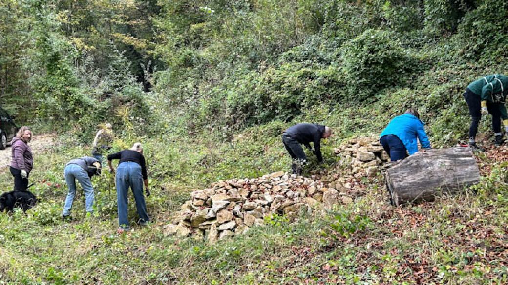 Weihers offen zu halten. Vor allem mussten die Steinhaufen von den wuchernden Brombeeren freigeschnitten werden,